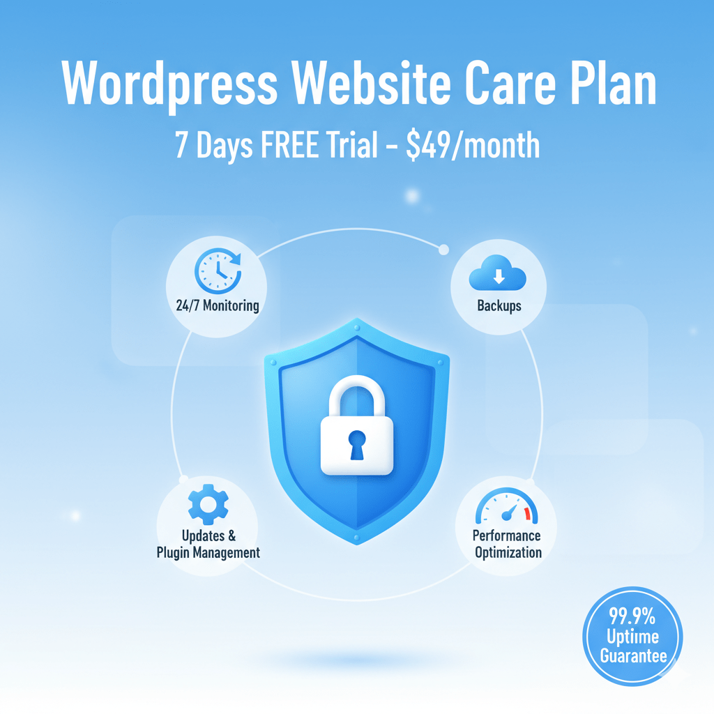 Our Complete Care Package includes 24/7 security monitoring, automatic WordPress core and plugin updates, weekly backups, performance optimization, malware removal, expert support, and monthly performance reports. Everything your WordPress site needs to stay secure and fast.
